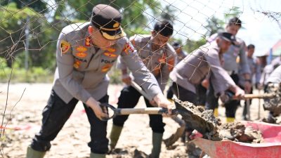 Dengan menggunakan peralatan seperti mesin apung pompa air, cangkul, sekop, dan gerobak dorong, Kapolres Pidie bersama personel bahu-membahu memulihkan fasilitas olahraga milik masyarakat tersebut.