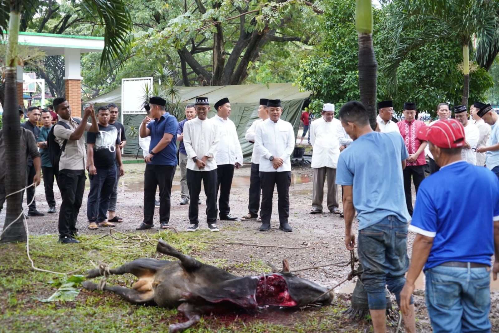 Kegiatan tradisi Meugang dilaksanakan di halaman mushola Lapangan Blang Padang. Pada pelaksanaan tahun ini, sebanyak empat ekor sapi disembelih sebagai hewan Meugang. Hewan tersebut berasal dari berbagai unsur, yakni Rindam Iskandar Muda, Bank BPD, Puskopdam IM, serta Kodim 0102/Pidie Korem 011/Lilawangsa. Keterlibatan berbagai pihak ini mencerminkan kuatnya sinergi dan kolaborasi antara institusi, satuan, serta elemen pendukung lainnya dalam menjalankan kegiatan sosial bagi masyarakat.