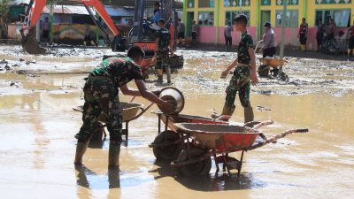 Setibanya di lokasi, personel Yonif TP 857/GG langsung melaksanakan pembersihan lumpur sisa banjir yang mengendap di halaman sekolah, ruang-ruang kelas, hingga saluran drainase. Dengan semangat kebersamaan dan gotong royong, para prajurit bekerja bahu-membahu menggunakan peralatan sederhana seperti cangkul, sekop, dan gerobak dorong guna mempercepat proses pembersihan.