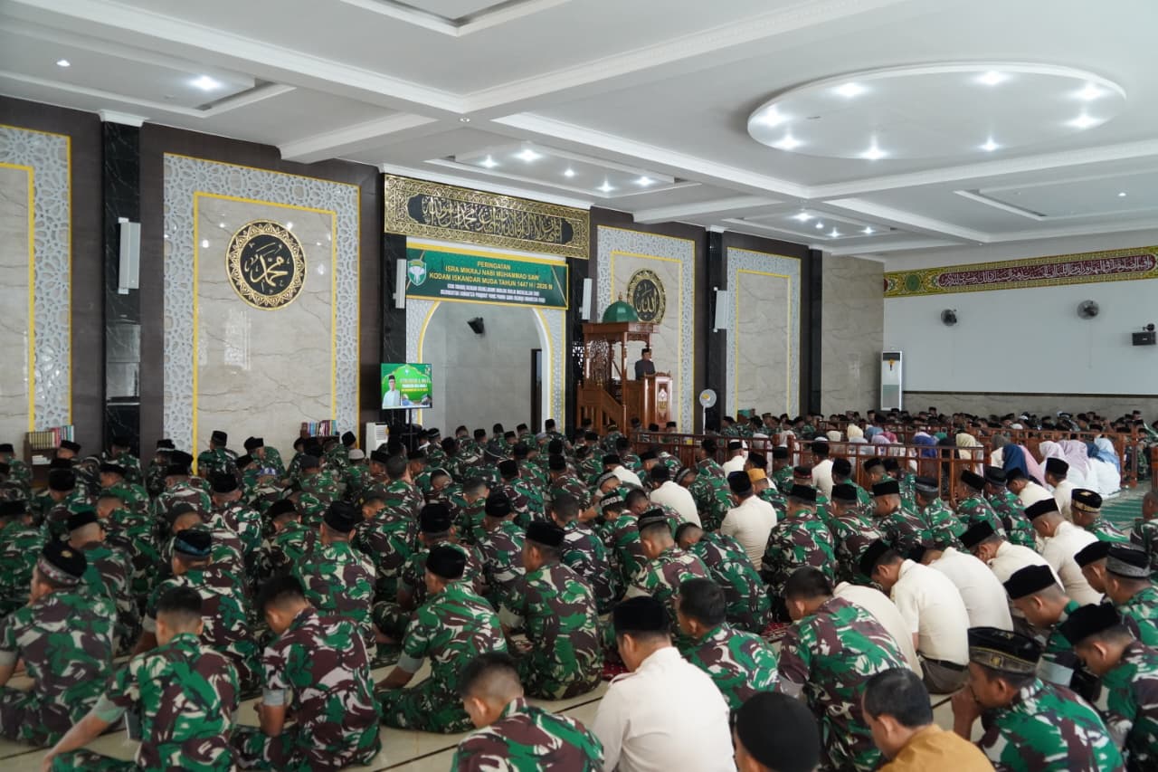 Banda Aceh ( Aceh dalam berita ) Kamis 22-1-2026 Panglima Komando Daerah Militer Iskandar Muda (Pangdam IM) Mayor Jenderal TNI Joko Hadi Susilo, S.I.P, menghadiri peringatan Isra Mikraj Nabi Besar Muhammad SAW Tahun 1447 Hijriah/2026 M yang diselenggarakan oleh Kodam Iskandar Muda di Masjid Baabul Mawaddah, Kegiatan ini berlangsung dengan penuh khidmat, religius, dan sarat makna spiritual, serta diikuti oleh seluruh prajurit dan Pegawai Negeri Sipil (PNS) di lingkungan Kodam Iskandar Muda.