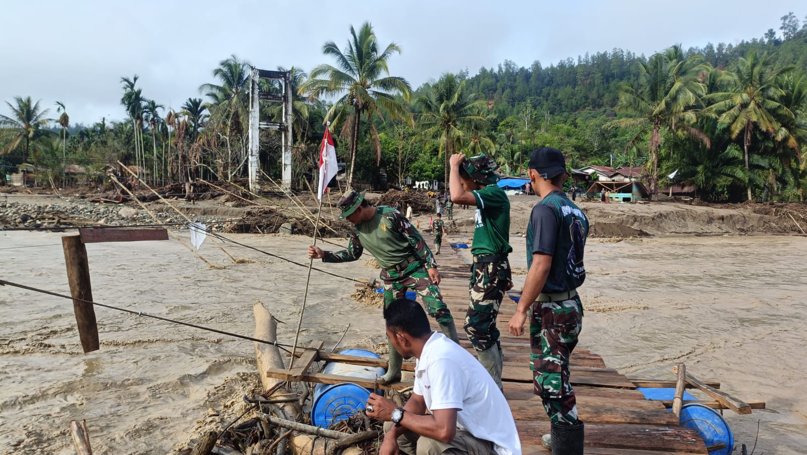 Menanggapi situasi tersebut, personel Kodim 0106/Aceh Tengah bergerak cepat melakukan penanganan darurat. Personel Koramil 05/Linge bersama anggota Yonif TP 854/DK serta masyarakat setempat langsung melaksanakan kerja bakti perbaikan jembatan apung guna memulihkan kembali akses transportasi warga.