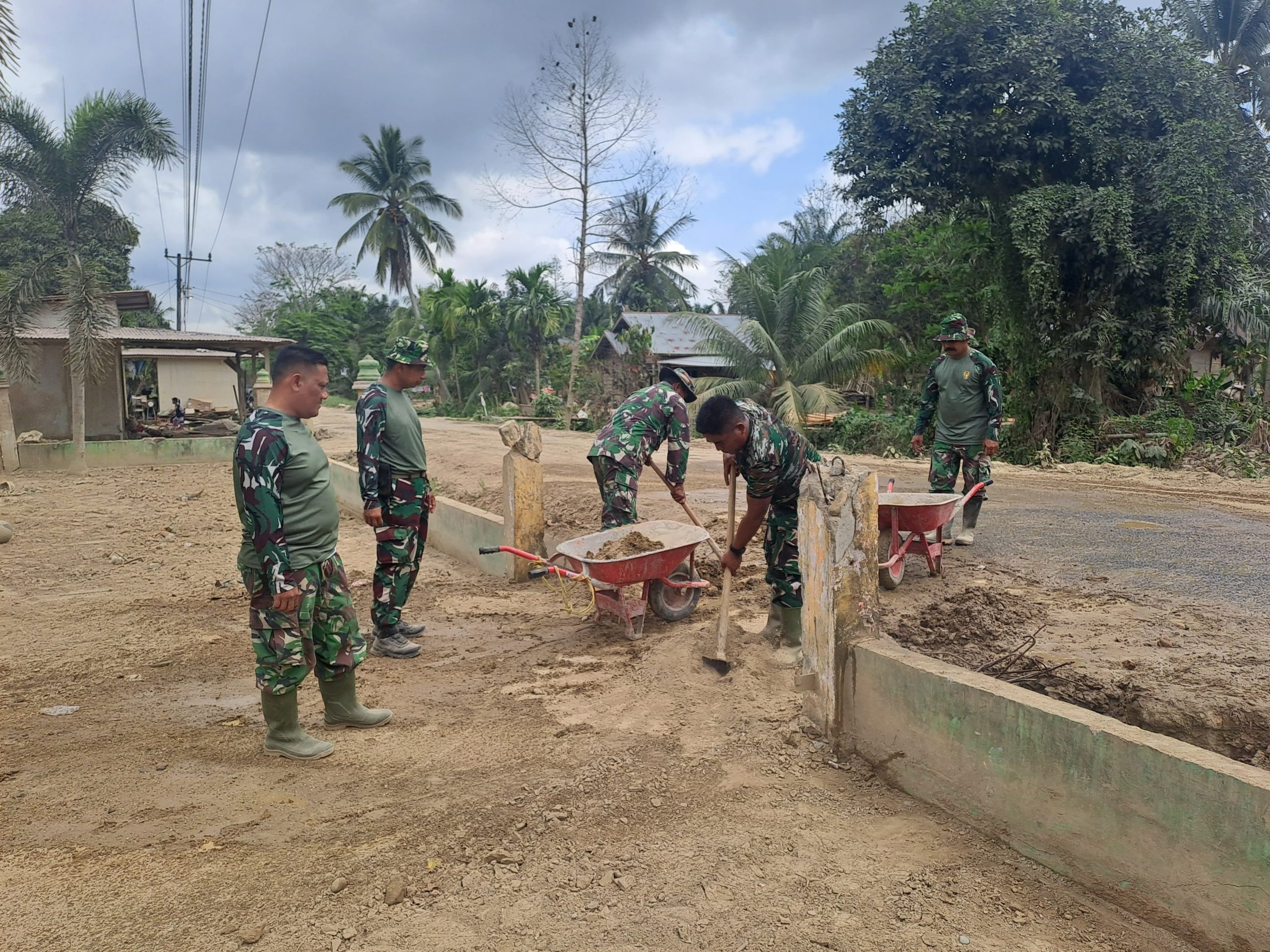 Sejak pagi hari, para prajurit TNI bersama personel kewilayahan bahu membahu melaksanakan pembersihan dan perbaikan fasilitas sekolah yang mengalami kerusakan cukup parah akibat terjangan banjir bandang. Kondisi bangunan sekolah sebelumnya dipenuhi lumpur, cat dinding mengelupas, plafon rusak, serta fasilitas sanitasi yang tidak layak digunakan, sehingga menghambat aktivitas belajar para siswa.